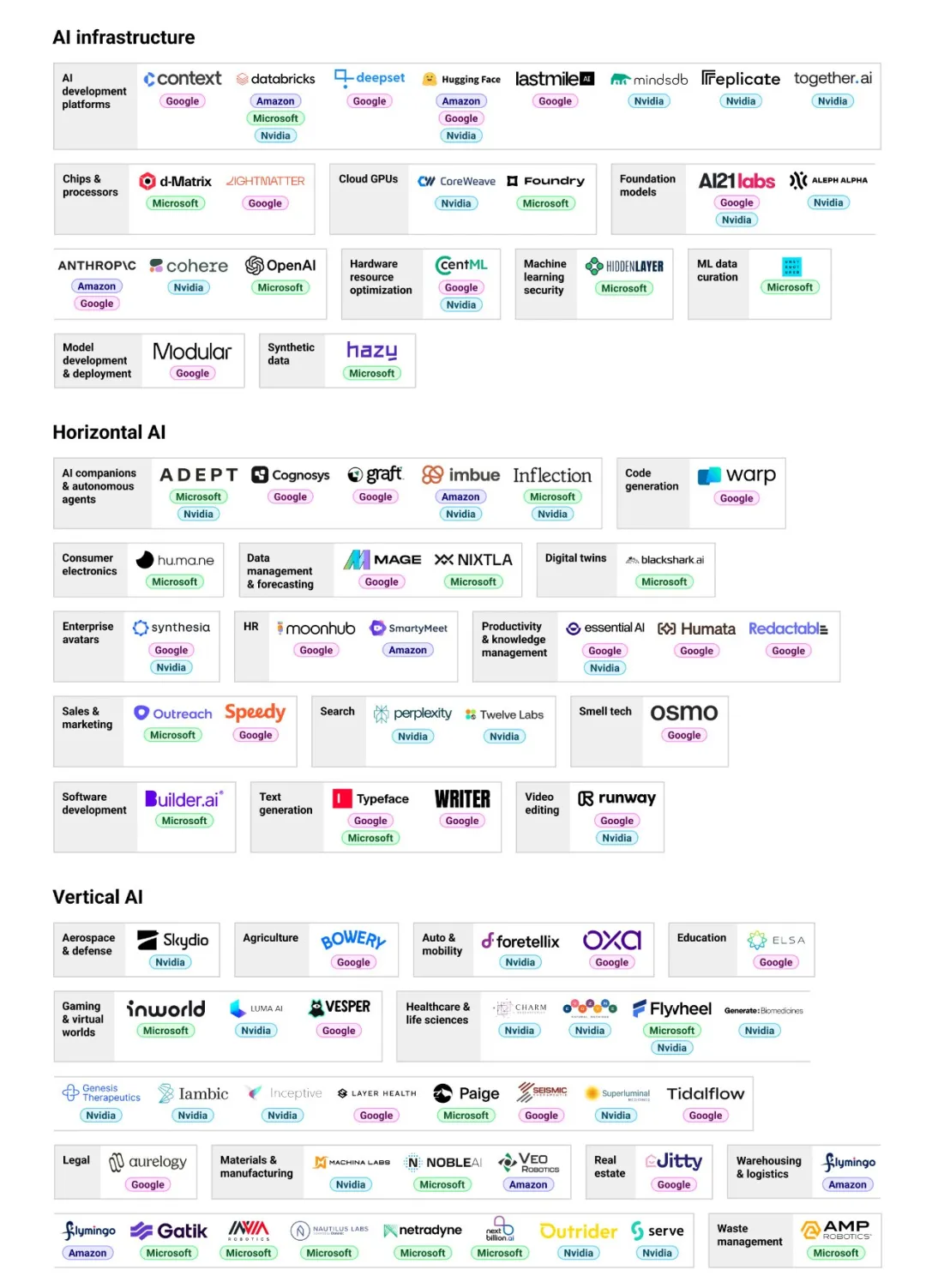 在这一轮AI技术革命中,科技巨头是产业资本的代表,并且在自己的生态中,实现了产业资本与金融资本的融合。云巨头是web与移动技术革命的赢家,积累了大量的“闲置”财富,账面上拥有成百上千亿美元的现金。这些科技巨头之间的竞争,已经从各自所擅长的数字经济领域,汇集到AI这技术革命趋势上,并非偶然,而是数字经济经过几十年发展而出现的一个不可避免的结果(historic imperative)。对于每一家科技巨头来说,AI是创新方向,它们做好了试验的准备,希望新的技术革命,增强和扩展其大部分现存业务。投资和收购初创AI企业,是其最重要的手段。去年,它们对AI初创企业的投资次数,比前一年多了57%,投资金额两倍于传统风投。今年,已经控制了OpenAI技术使用的微软,与独角兽开源AI企业Mistral达成深度合作;亚马逊兑现了对Anthropic总额40亿美元的第二笔投资款。巨头们采用了一种所谓“云洗钱”的方式,将投资消化在自己的业务体系内。它们从英伟达购买算力硬件GPU芯片,去年全年接近500亿美元,构建以AI加速为中心的智能数据中心,以“云信用”入股上述初创企业。后者在此之上训练越来越强大的大模型,吸引越来越多用户使用它们的API服务与AI推理。这些都表现为云巨头的云服务业务的增长,体现在每一个季度的财报上,拉动了AI 计算业务的增长,也推升了公司股价的增长。