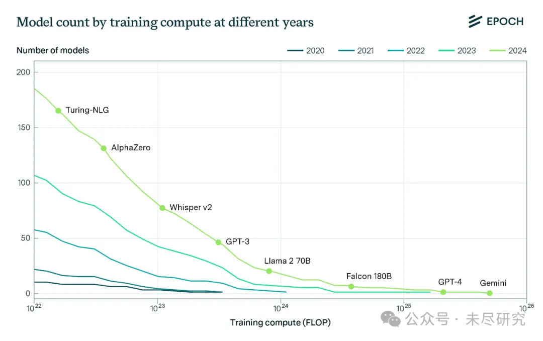 大模型正在变成智能算力密集的行业。在2020年,只有2个模型超过了10^23FLOP,到2024年,这样的模型数量增长到了81个;最强大模型的预训练算力需求已经来到了10^26 FLOP量级,并继续按训练算力需求每3.4个月翻倍的规律往前发展。